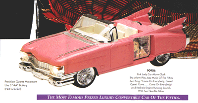 Model 90906 Pink lady car alarm clock. The alarm plays jazz music of the fifties and sings, "Come on Everybody, Come! Come! Come....Come on Everybody!" All realistic engine running sounds with two headlight glow. Our Price: $69.95 UPS, Ins: $4.95 |