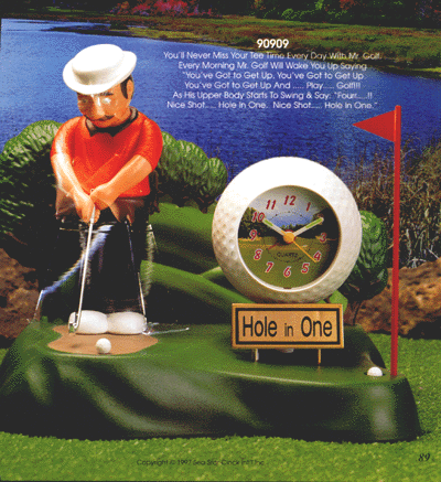 Model 90909 You'll never miss your tee time every day with Mr. Golf. Every morning Mr. Golf will wake you up saying, "You've got to get up, You've got to get up, You've got to get up and ......play.....golf!!!" As his upper body starts to swing and say, "Four...!! Nice Shot...Hole in One. Nice Shot....Hole in One." Our Price: $84.50 UPS, Ins: $4.95 |