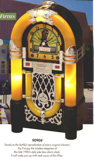 Model 90904 Thanks to the faithful reproduction of every original element. You'll enjoy the timeless elegance of the late 1950's style juke box alarm clock. It will wake you up with rock music of the fifties. Our Price: $44.95 UPS, Ins: $4.95 |