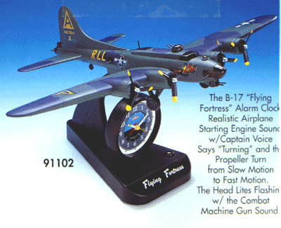 Model 91102 The B-17 "Flying Fortess" alarm clock. Realistic airplane starting engine sound w/captain voice, says "Turning" and the propeller turns from slow motion to fast motion. The head lights flashing with the combat machine gun sound Our Price: $72.50 UPS, Ins: $5.95 |