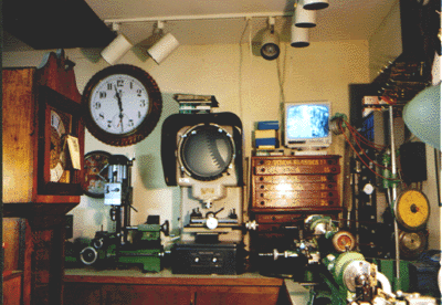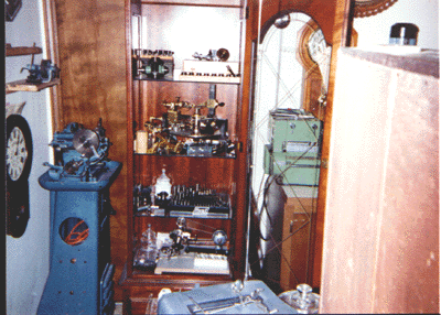 Welcome to our shop! This is the hidden back of the store that people seldom see, but ask about! Sometimes people think the work is done with a "few simple tools." This is not the case. Major investments in education, experience, and machinery are required, We have an 800 book in the shop Horological(Clock & Watch) library in the shop and we belong to many trade organizations. The skill of the clock and watchmaker develops over many years. We learn something new everyday! Also since clock repair is not an 8 hour a day job a few pictures of our home workshop is included, where we work on our own projects. Our wanted section for things that we will buy from you. Feel free to have a look around our shop.
